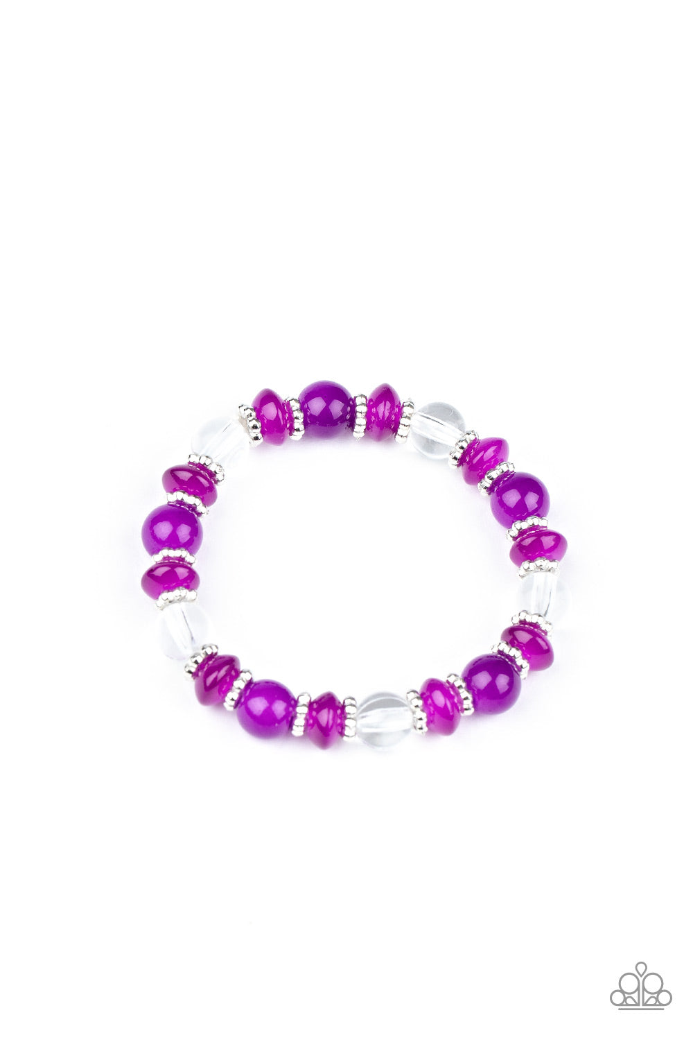 Pack of ten bracelets in assorted colors and shapes with a retail price of $1 each. Featuring studded silver accents, the glassy beaded stretchy bracelets vary in shades of purple, blue, pink, yellow, and clear.